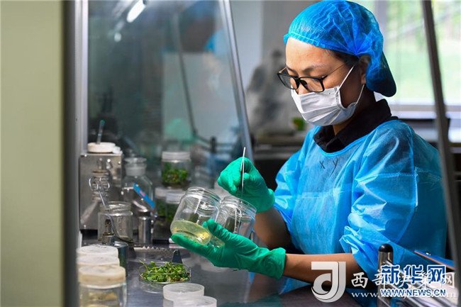 在億利集團庫布其生態科技中心的沙生植物育苗實驗室內,科研人員進行組培試驗(7月11日攝)。 新華社記者 彭源 攝