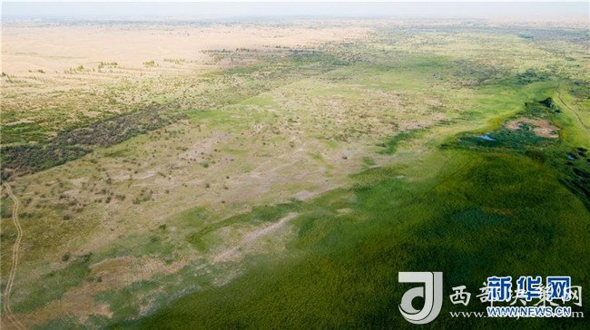 這是位于庫布其沙漠中的七星湖沙漠生態旅游區(7月11日無人機拍攝)。 新華社記者 彭源 攝