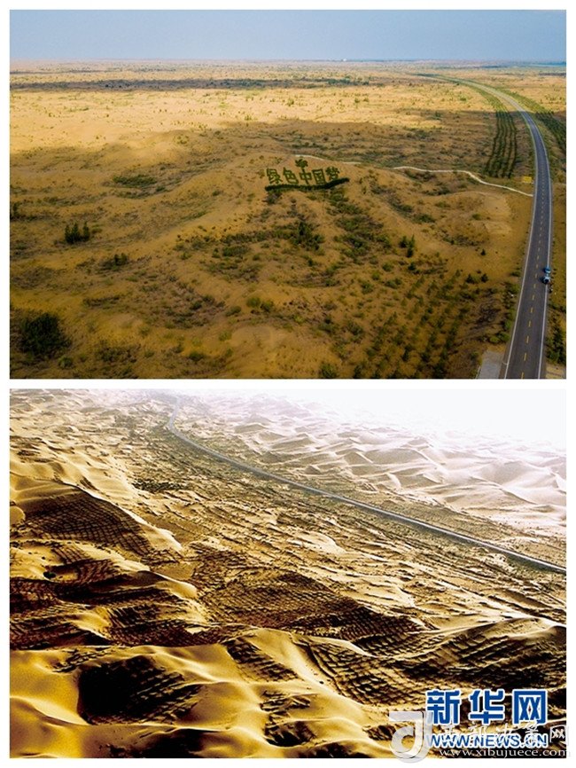 這是內蒙古鄂爾多斯市杭錦旗庫布其沙漠穿沙公路周邊環境的對比(拼版照片:上為2018年7月11日新華社記者彭源攝;下為資料照片)。 新華社發