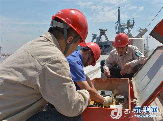 在長江岸線南通段一處港口碼頭,技術人員為靠泊貨輪連接岸電系統(6月2日攝)。新華社發(李存根 攝)