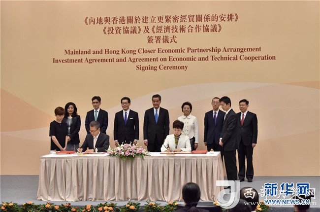 2017年6月28日在香港特區政府總部拍攝的《內地與香港關于建立更緊密經貿關系的安排》(CEPA)下的《投資協議》和《經濟技術合作協議》簽約儀式現場。 新華社發(王璽攝)