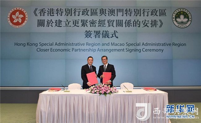 香港特區政府財政司司長陳茂波(右)和澳門特區政府經濟財政司司長梁維特在香港簽署《香港特別行政區與澳門特別行政區關于建立更緊密經貿關系的安排》(2017年10月27日攝)。新華社記者呂小煒攝