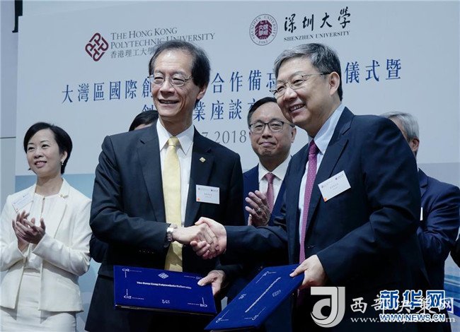 2018年7月18日,在香港理工大學,香港理工大學校長唐偉章和深圳大學校長李清泉(前右)簽署“大灣區國際創新學院”合作備忘錄后握手。新華社發(王申攝)