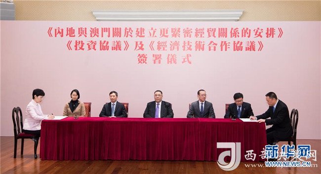2017年12月18日拍攝的商務部與澳門特區政府《內地與澳門關于建立更緊密經貿關系的安排》(CEPA)下的《投資協議》和《經濟技術合作協議》簽約儀式現場。新華社記者張金加攝