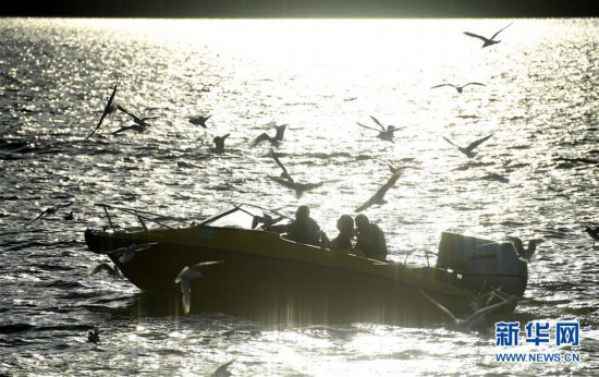 11月14日,人們?cè)诶ッ鞯岢剡吪c紅嘴鷗嬉戲。