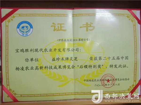 2018年寶雞勝利農業開發有限公司生產的特色優質拳頭產品“益珍禾”牌靈芝參展第二十五屆農高會,以卓越的品質喜獲“后稷特別獎”。(供稿人:豆清海)