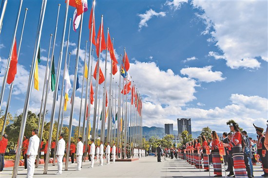 圖為省第十一屆少數民族傳統體育運動會代表團升旗儀式在臨滄市體育運動中心體育場舉行。夏方海 攝