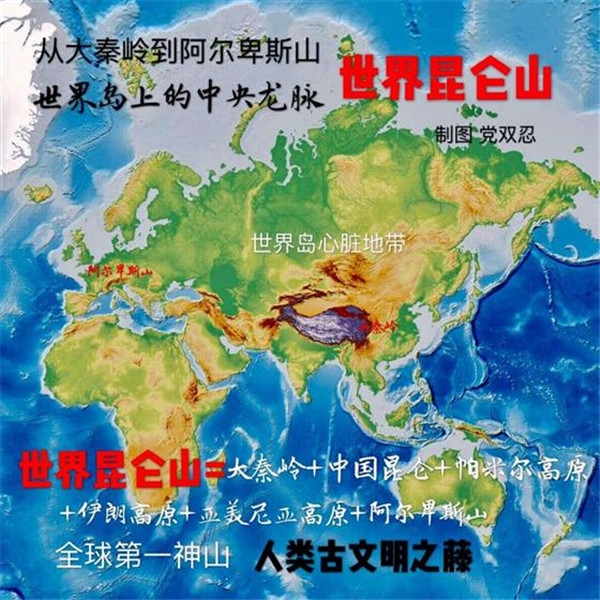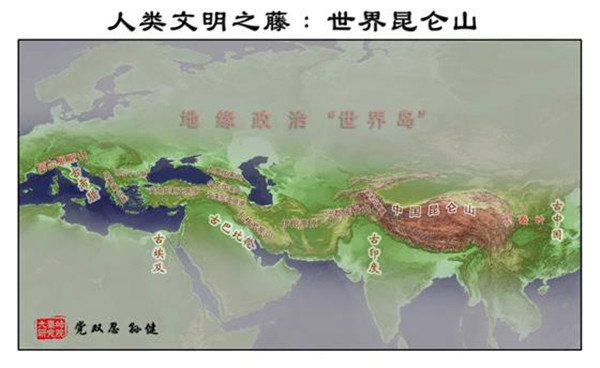 按照中國傳統的龍脈理論,“亞歐大陸的脊梁”也是“世界島”中央龍脈所在。由于人類古文明,包括古華夏、古印度、古波斯、古巴比倫,古希臘,皆源自“亞歐大陸脊梁”,所以也可稱其為“世界昆侖山”。著名的“絲稠之路”,也是從中國大秦嶺到歐洲阿爾卑斯山之路,也可稱之為“世界昆侖山之路”。過去,德國人首先“發現”了古老的“絲綢之路”。進入21世紀,英國人又率先以“絲綢之路”的視角,重新著述了“一部全新的人類史”。今天,中國人以“亞歐大陸的脊梁”為視野,將“世界島”連為一體,著述“一帶一路”,著述“大秦嶺到阿爾卑斯山之路”,著述“世界昆侖山之路”,也算是一個世界“地理新發現”。