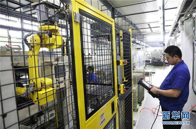 在位于重慶永川鳳凰湖工業園的重慶西源凸輪軸有限公司,工作人員在調試自動化生產設備(2018年7月31日攝)。新華社記者王全超攝