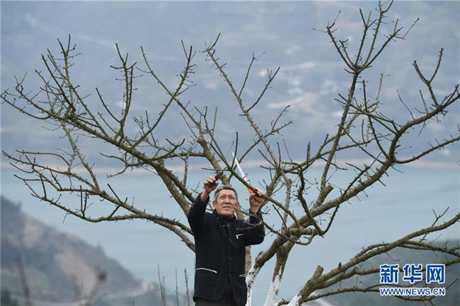 重慶市巫山縣曲尺鄉朝陽村村民在脆李種植地里對脆李樹進行管護(2019年2月16日攝)。新華社記者王全超攝