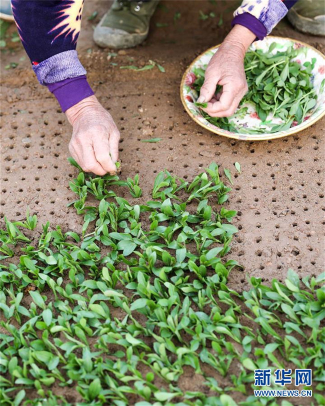 3月11日,在明光市管店鎮甜葉菊育苗扶貧基地,農戶在扦插甜葉菊苗。 新華社記者 曹力 攝