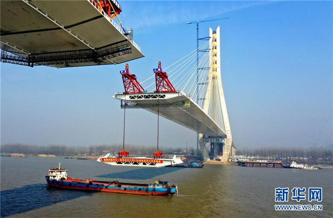 3月13日,在安徽池州長江公路大橋建設現場,中交二航局施工機械在吊裝鋼箱梁(無人機拍攝)。 新華社發(過仕寧 攝)