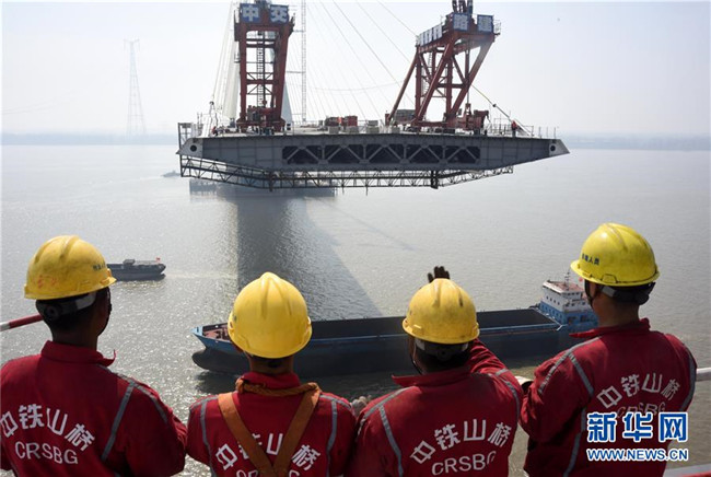 3月13日,在安徽池州長江公路大橋建設現場,施工人員在關注鋼箱梁吊裝進度。新華社發(過仕寧 攝)
