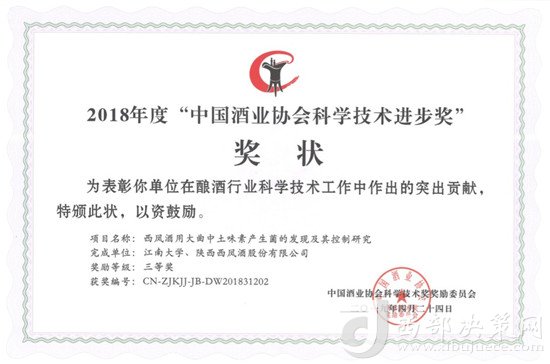 近日,中國酒業協會第五屆理事會擴大會議在北京隆重舉行,大會突出表彰了在釀酒產業科技發明、技術推廣、科技成果轉化等方面取得了杰出業績和重要貢獻的領軍人才和優秀專家,表彰了2018年度“中國酒業協會科學技術獎”獲獎項目和論文的完成單位及個人,并頒發證書及獎金。西鳳集團公司《西鳳酒用大曲中土味素產生菌的發現及其控制研究》項目榮獲中國酒業協會科學技術進步獎三等獎。受到了大會表彰。