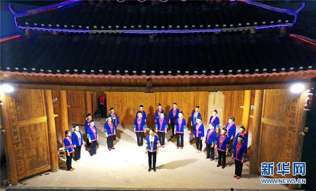 5月27日晚,在廣西柳州市三江侗族自治縣良口鄉燕茶村,吳純娟(前排中)與村民在戲臺上排練侗族大歌(無人機拍攝)。