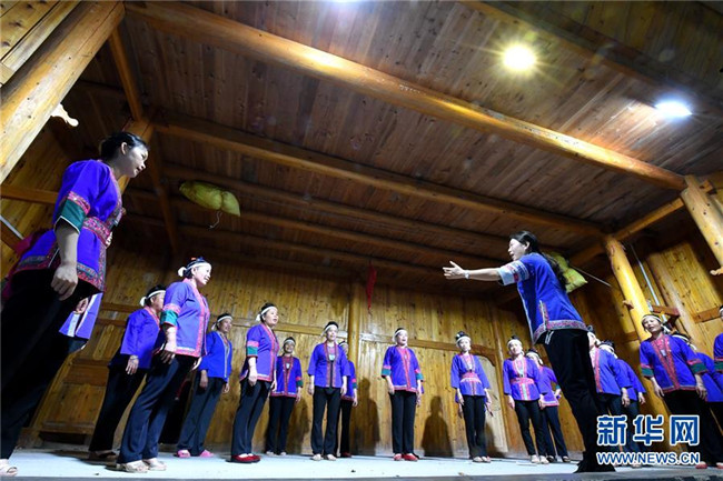 5月27日晚,在廣西柳州市三江侗族自治縣良口鄉燕茶村,吳純娟與村民在戲臺上排練侗族大歌。 今年42歲的吳純娟是廣西柳州市三江侗族自治縣文化館的一名文藝輔導員。她從小喜歡唱歌,工作后接觸并喜歡上侗族大歌,2005年起專門拜師學唱侗族大歌。如今,侗族大歌成為她主要輔導和傳承的音樂之一。今年3月中旬,她成為三江縣良口鄉燕茶村一名駐村工作隊員,侗族大歌是她扶貧的法寶。 燕茶村位于侗鄉大山深處的山腰上,村民們雖然熱愛歌舞,但卻無人會唱侗族大歌。吳純娟進村后,當即在村里開設了侗族大歌免費培訓班,利用晚上及其他工作之余的時間教村民唱侗族大歌,受到村民歡迎。如今,燕茶村專門成立“侗族大歌文藝隊”,隊員從一開始的20人迅速發展到33人。村部會議室、村里的戲臺、還有山上的千畝茶園……他們的歌聲幾乎傳遍了燕茶村的每個角落。 “這段時間,吳老師還利用休息時間教學校老師和學生唱侗族大歌。”燕茶村燕子小學老師楊雪連說,學校里從來沒有音樂老師,吳老師在學校里開班,師生們學習熱情也非常高。 吳純娟說:“每首侗族大歌歌唱的都是自然、勞動和愛情之美,傳承民族文化的同時,我更希望激發貧困山區群眾對美好生活的向往,提高自信,共同脫貧致富。”據了解,侗族大歌是侗族地區一種多聲部、無指揮、無伴奏、自然和聲的原生態音樂。2005年,侗族大歌被列入我國第一批非物質文化遺產名錄,2009年被列入世界人類非物質文化遺產代表作名錄。