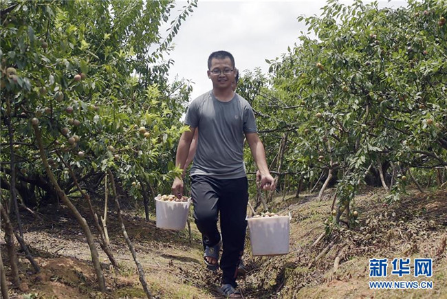 6月11日,游客在欽南區那麗鎮殿艮村的“扶貧李園”游玩。