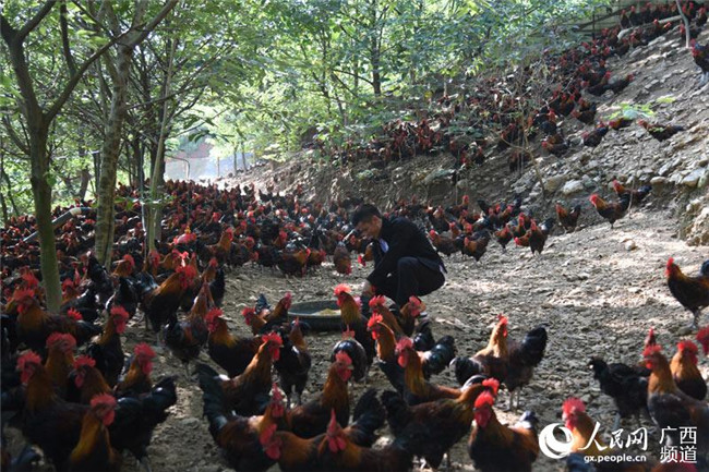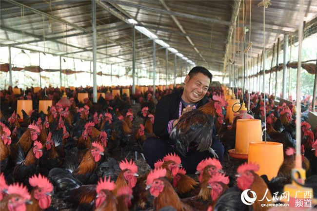 潞城瑤族鄉豐防村黨支部書記梁少生對養殖雞進行悉心管護