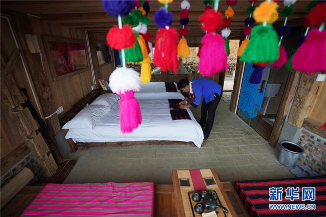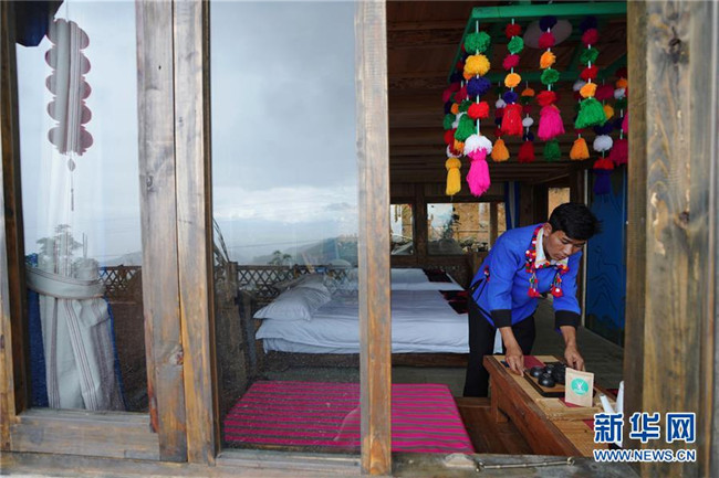 在云南省芒市三臺山德昂族鄉出冬瓜老寨,趙臘退在他的民宿“上上居”整理客房床鋪(6月19日攝)。 新華社記者 秦晴 攝