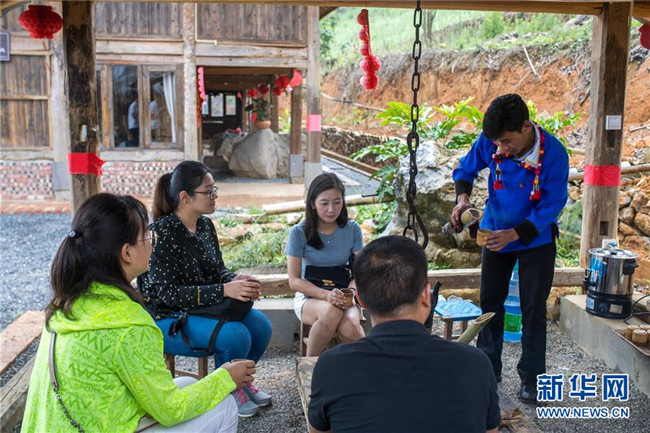 在云南省芒市三臺山德昂族鄉出冬瓜老寨,趙臘退(右)在民宿招呼客人(6月19日攝)。新華社記者 胡超 攝
