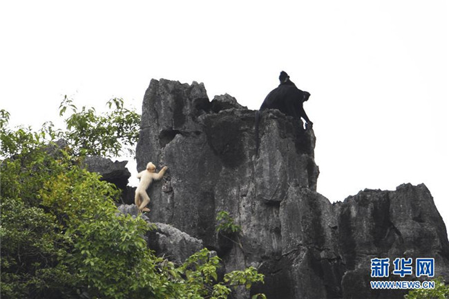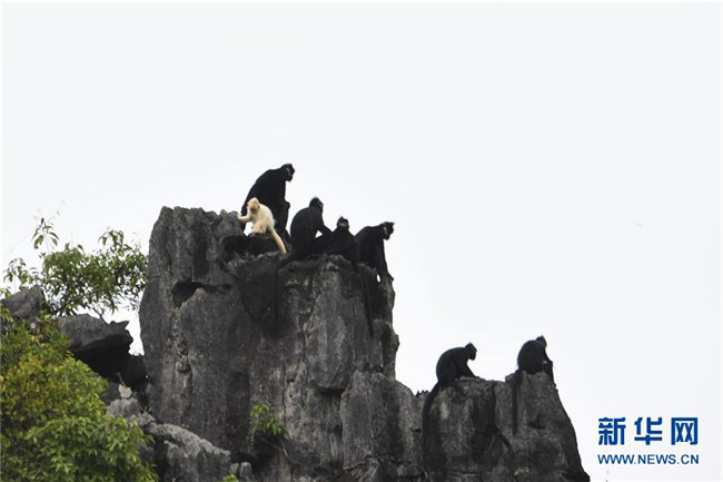 7月4日,白化黑葉猴幼體和同種群其他黑葉猴出現在廣西大新縣桃城鎮寶新村城南小學后山上。新華社記者 曹祎銘 攝