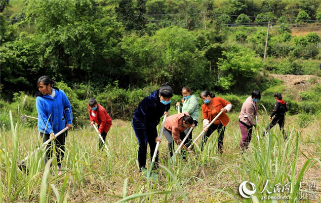 在廣西柳州市融安縣沙子鄉紅妙村,勞務隊成員在村集體經濟甘蔗示范點勞作。譚凱興攝