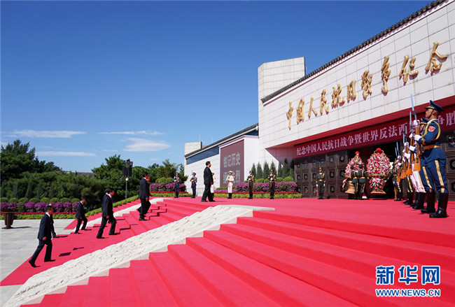 9月3日上午,習近平、李克強、栗戰書、汪洋、王滬寧、趙樂際、韓正、王岐山等黨和國家領導人來到中國人民抗日戰爭紀念館,出席紀念中國人民抗日戰爭暨世界反法西斯戰爭勝利75周年向抗戰烈士敬獻花籃儀式。 新華社記者 王曄 攝