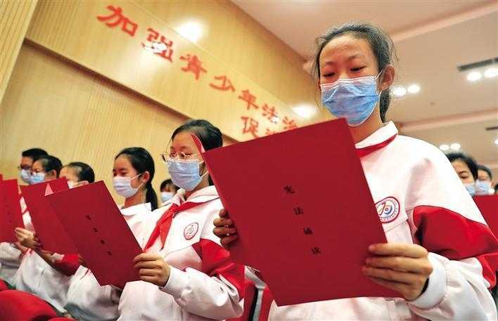 11月30日,陜西省2020年“憲法宣傳周”啟動儀式在西安舉行。全省13個市(區)107個縣(區)統一啟動實施。這是西安高新區第五小學探花嶺校區學生正在誦讀憲法。 記者 安濤 攝
