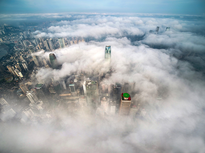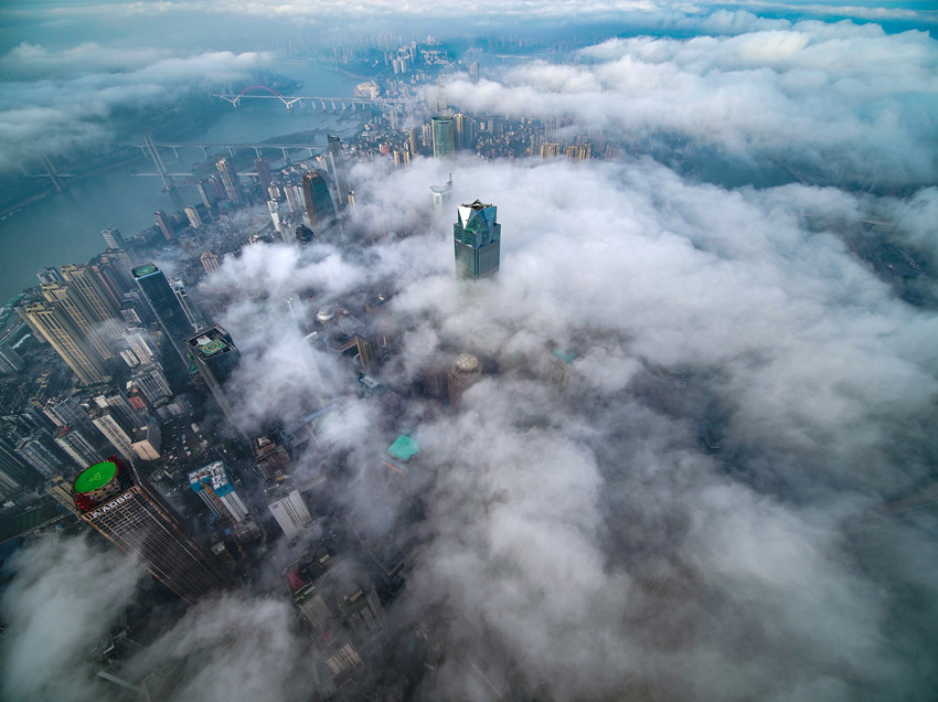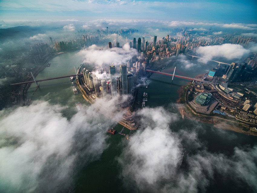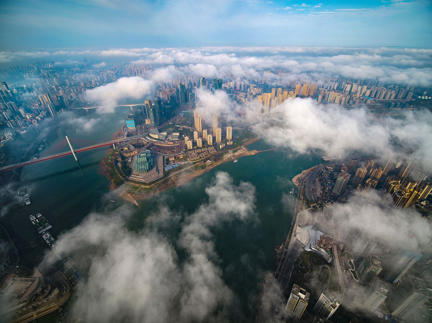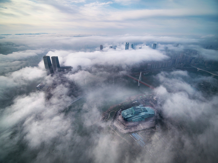航拍重慶城區,云霧繚繞宛如仙境。王正坤攝
