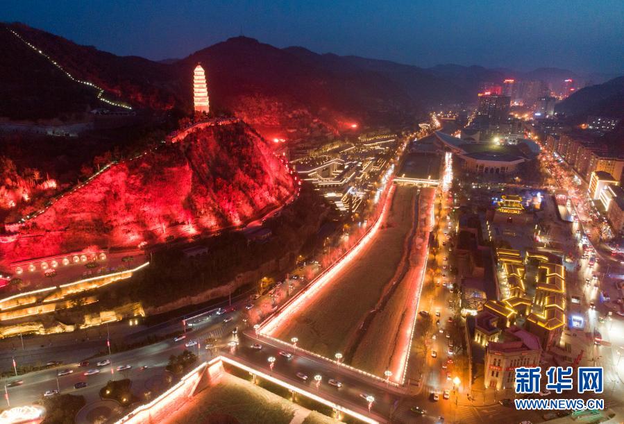 寶塔山下延安城區夜景(2月8日攝,無人機照片)。新華社記者 邵瑞 攝