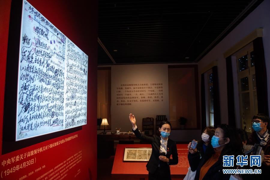 “毛澤東同志香山時期發布電報手稿專題展覽”在北京香山革命紀念館開展,講解員(左一)向媒體記者介紹電報內容(2020年12月16日攝)。新華社記者 陳鐘昊 攝