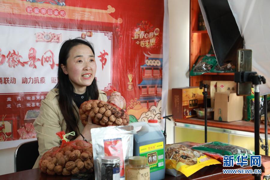 2月23日,在位于甘肅隴南市徽縣的店鋪中,全國人大代表梁倩娟在網上直播銷售當地農特產品。 新華社記者 張智敏 攝