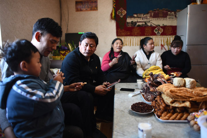 ↑ 3月10日,尕瑪松保(左三)和家人在家中吃早飯。