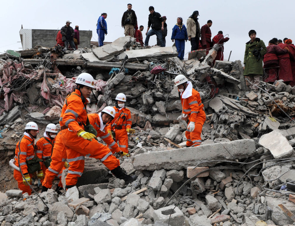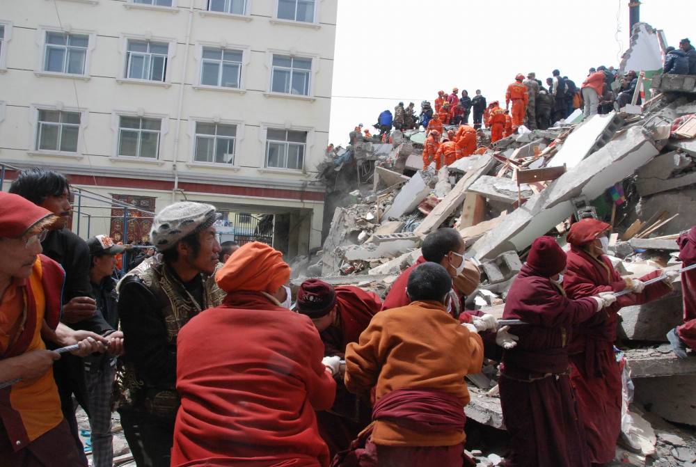 ↓ 圖為2010年4月16日,救援人員在結古寺賓館進行救援。