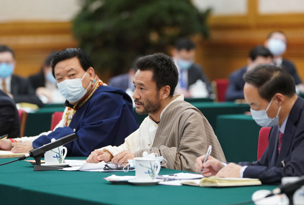↑ 3月7日,在參加十三屆全國人大四次會議青海代表團審議時,扎西多杰就玉樹災后重建新變化發言。新華社記者李學仁攝