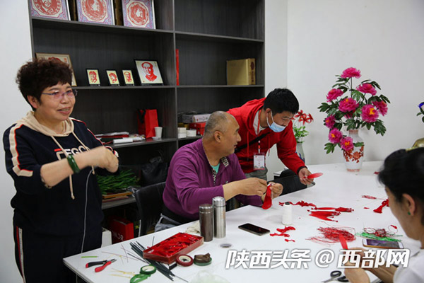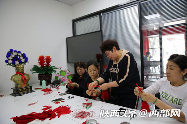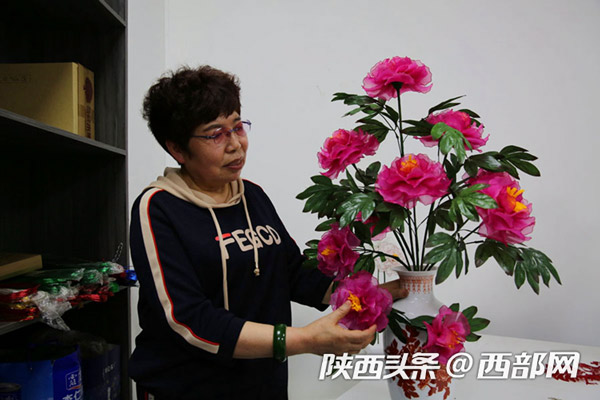延安市寶塔區電商直播融合孵化服務中心,60歲的退休大媽董智玲在教大家做絲網花,她們做著山丹丹花,唱著《山丹丹花開紅艷艷》,到這里來學手工花的制作成了一件快樂的事。