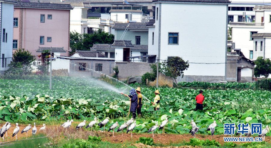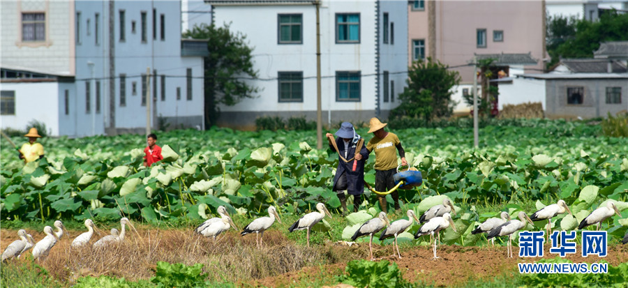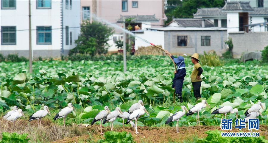 近日,云南省彌勒市竹園鎮農民在荷田間勞作,不遠處許多鉗嘴鸛在田邊地頭棲息覓食,一幅人鳥和諧的生態畫卷徐徐展開。2006年,中國在云南大理首次記錄到鉗嘴鸛。近年來,隨著生態環境不斷改善,云南多地均發現鉗嘴鸛。新華網發(普佳勇攝影報道)