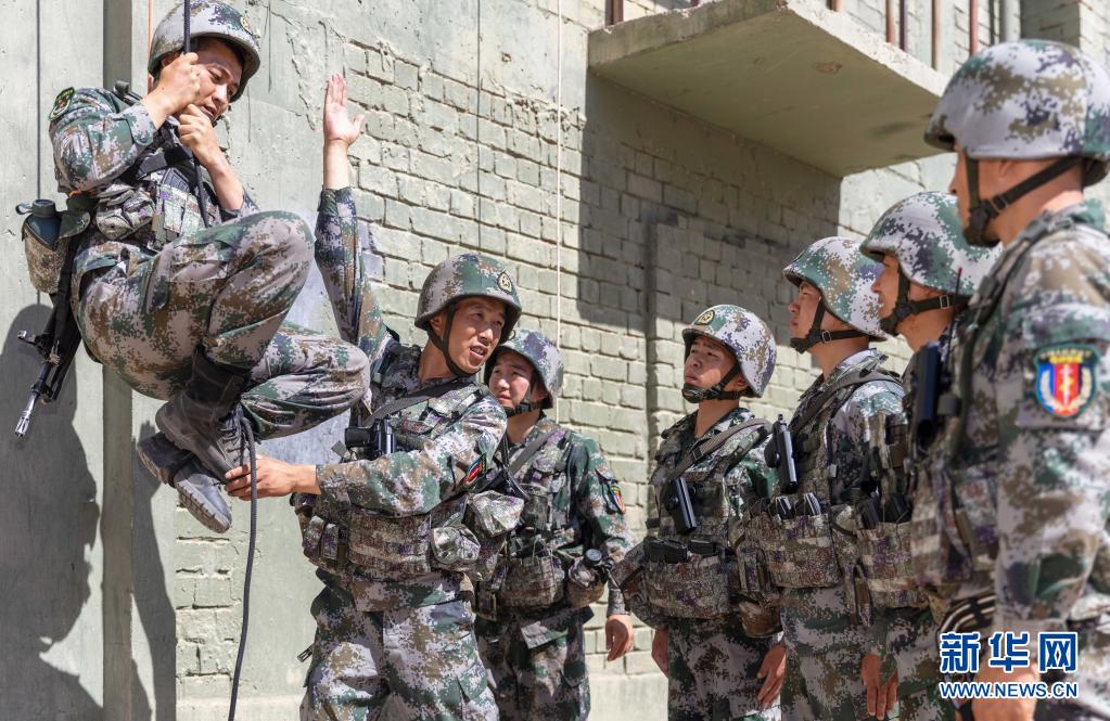 陸軍第76集團軍某特戰旅特戰營營長劉近(左二)為戰士講解攀登動作要領(7月7日攝)。新華社發(陳浩 攝)