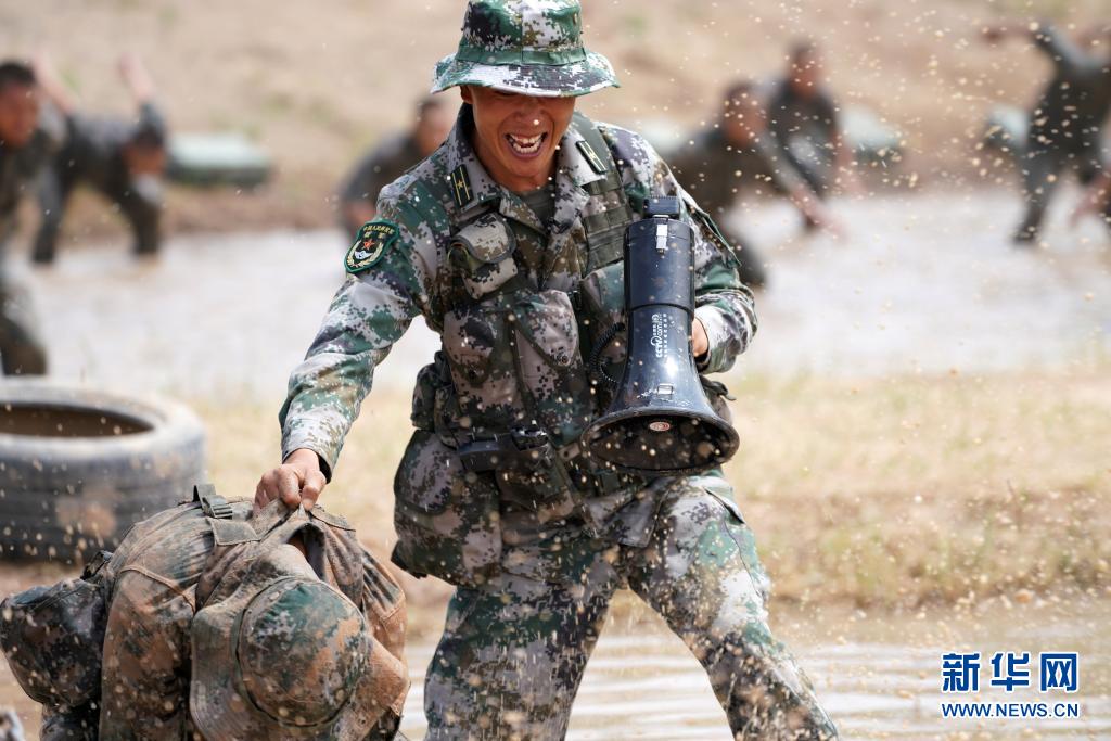 陸軍第76集團軍某特戰旅特戰營營長劉近組織特戰隊員進行泥潭摔擒訓練(7月14日攝)。新華社記者張永進攝