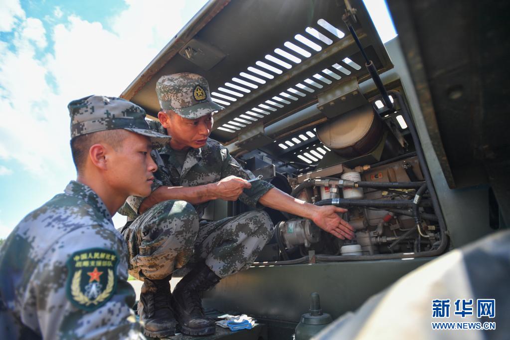 戰(zhàn)略支援部隊某大隊一級軍士長高玉華(右)現場指導排除工程機械故障(7月23日攝)。新華社記者 陳澤國 攝