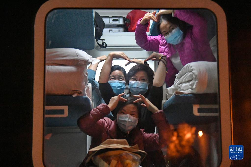 10月29日,滯留游客離開額濟納旗時,在列車車廂里擺出一個個“愛心”。新華社發(王磊 攝)