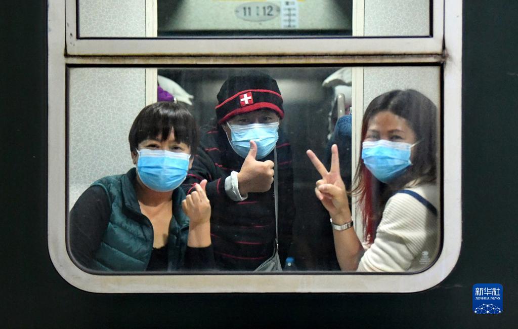 10月29日,滯留游客離開額濟納旗時,在列車車廂里與地面人員告別。新華社發(王磊 攝)