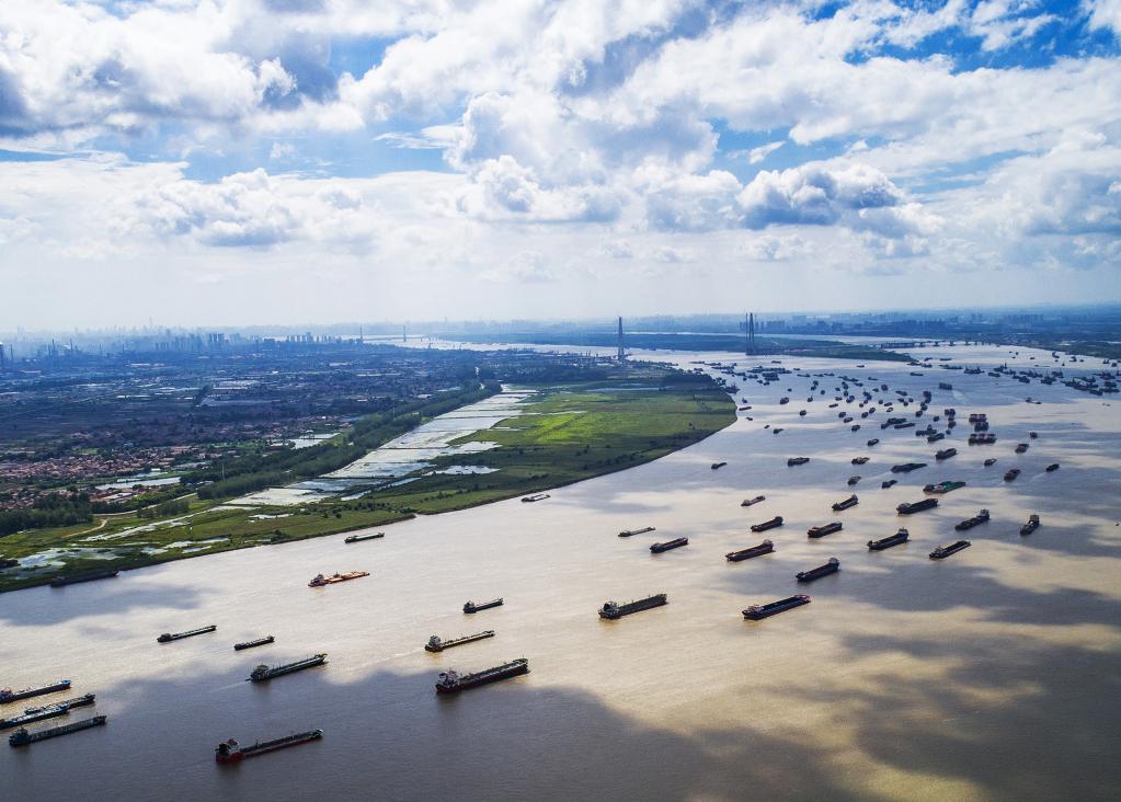 這是2018年8月13日通過無人機拍攝的船舶在湖北省武漢市陽邏港區水域行駛。(新華社記者肖藝九攝)