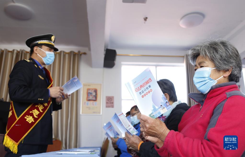 12月4日,在河北省邢臺市襄都區(qū)東郭村鎮(zhèn)南康莊村,普法志愿者在給村民進行普法宣傳。新華社發(fā)(張馳 攝)