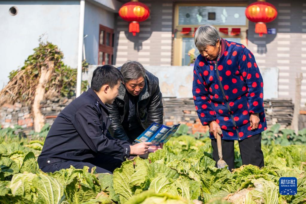 12月4日,江蘇省泰州市海陵區(qū)蘇陳派出所民警在蘇陳社區(qū)田間地頭向農(nóng)戶進行普法宣傳。 新華社發(fā)(湯德宏 攝)