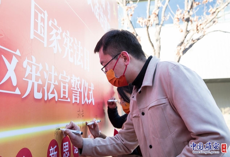 “我宣誓:忠于中華人民共和國憲法,維護憲法權威,履行法定職責……”當日上午,在雄安市民服務中心會議中心門前,新區各部門以及雄安集團工作人員代表右手握拳,進行莊嚴宣誓。
