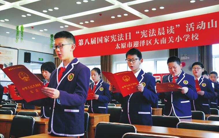 12月3日,迎澤區大南關小學開展“憲法晨讀”活動。該校作為第八屆國家憲法日“憲法晨讀”山西分會場,通過讓學生們朗讀憲法、收看直播等方式宣傳憲法知識。(徐浩軒 攝)
