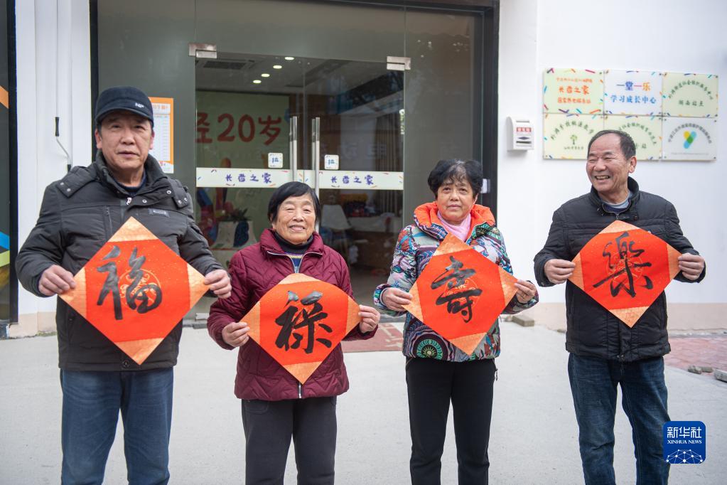 1月18日,江北區桃源小區的居民拿著寫好的字在“長者之家”門口合影。該小區老年人居住比例較高,在老舊小區改造過程中,街道將小區內閑置用房改造成集老年大學、幼兒托管等為一體的“長者之家”。新華社記者 江漢 攝