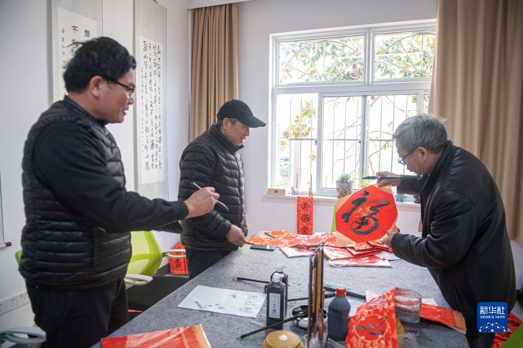1月18日,江北區桃源小區的居民在“長者之家”寫“福”字。該小區老年人居住比例較高,在老舊小區改造過程中,街道將小區內閑置用房改造成集老年大學、幼兒托管等為一體的“長者之家”。新華社記者 江漢 攝