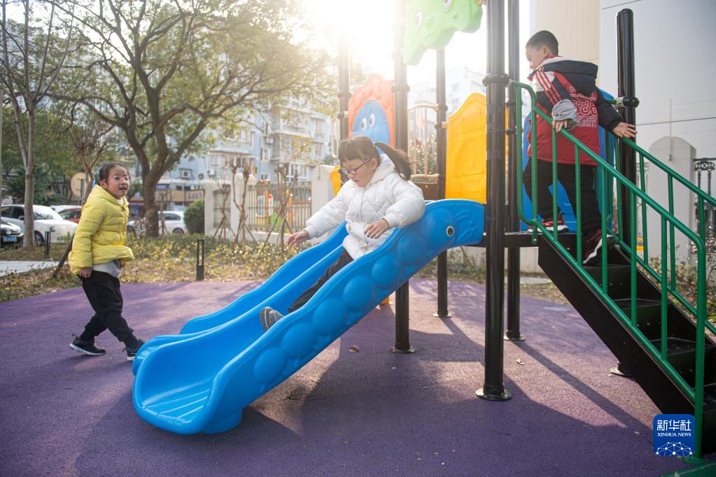 1月18日,小朋友在江北區桃源小區里玩耍。新華社記者 江漢 攝